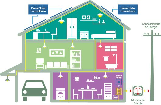A energia gerada pelo sistema durante o dia poderá ser consumida e o excedente será injetado na rede elétrica, gerando crédito para o consumo noturno, ou quando não estiver gerando sua própria energia.
